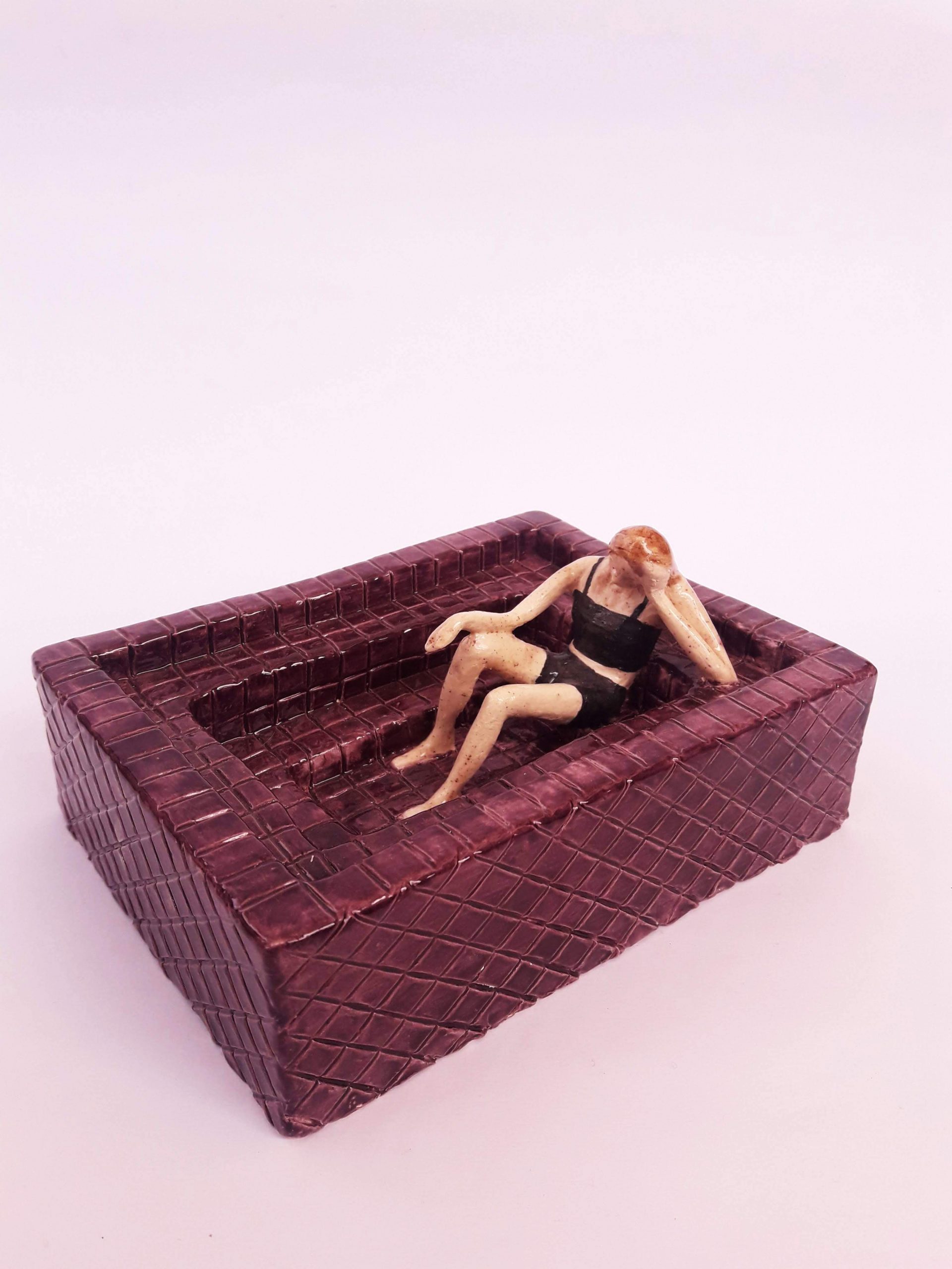 La obra reúne mujeres y pequeñas piscinas realizadas en cerámica, en un mismo espacio, cada una situada en su soledad, generando un clima reflexivo que las vincula.