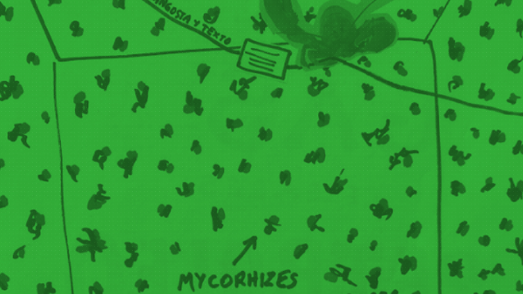 Chtonic Futur es un proyecto que Carlos Ginzburg diseñó para su exhibición en la sala A del Centro de Arte de la UNLP. Para nombrarlo, el artista juega con las palabras dado que “ctónico” es una de las variantes que se utilizan en la lengua griega para designar tierra o perteneciente a la tierra y, a su vez, refiere al inframundo y a los espíritus que lo habitan. De manera que en Chtonic Futur vuelve a trabajar sobre las problemáticas ecológicas contemporáneas, como en Post-Madre tierra (2019)[1], intervención que realizó junto con el Centro de Arte en la Facultad de Psicología de la UNLP. En esta oportunidad, cuatro paneles anuncian el desextractivismo de recursos naturales (gas, carbón y petróleo) que simulan estar bajo tierra, acompañados de raíces y hongos dibujados a modo de una red de micorrizas o de asociaciones simbióticas.