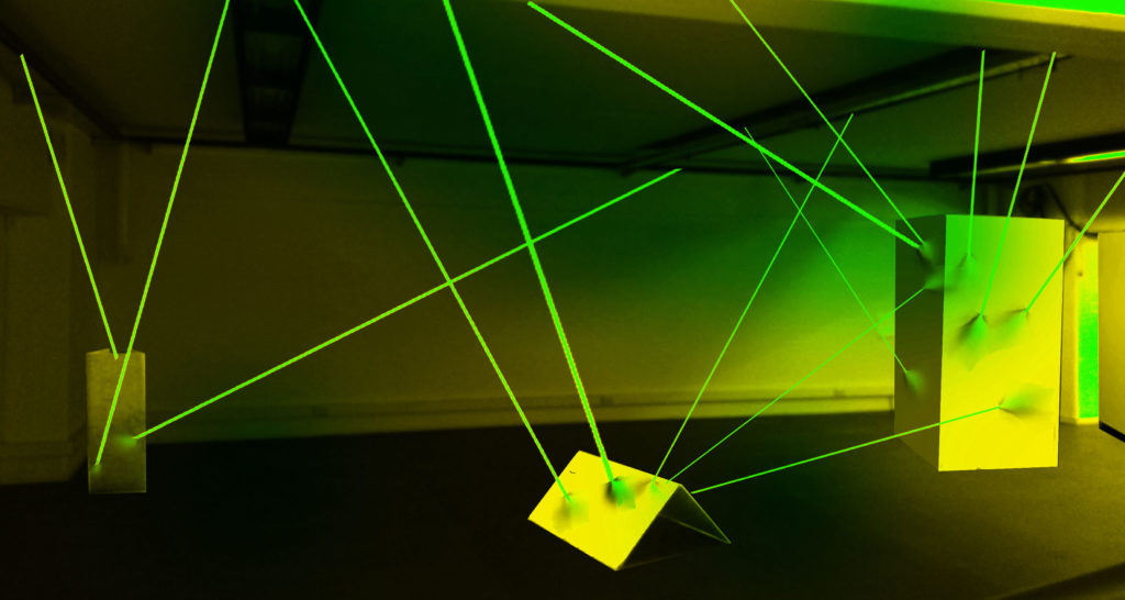 El núcleo principal de la obra se despliega a partir del concepto de “paralelo” que transforma lo establecido en una contracara divergente y abstracta. Al percibir la obra, el clima espacial establecido se resignifica con la experiencia, y de manera rizomática, la idea de dimensiones alternas acontece, sugiriendo una percepción diferente, paralela y particular, una percepción óptica nueva. Paralelismo reflexiona el hecho, lo cuestiona y repregunta ante sus límites, alcances y amplitudes, construye tensiones opuestas e indaga en la dialéctica que la forma contrastante establece, construye y estructura, abordando líneas con cualidades que abarcan y generan corrimientos en el pensamiento a priori.